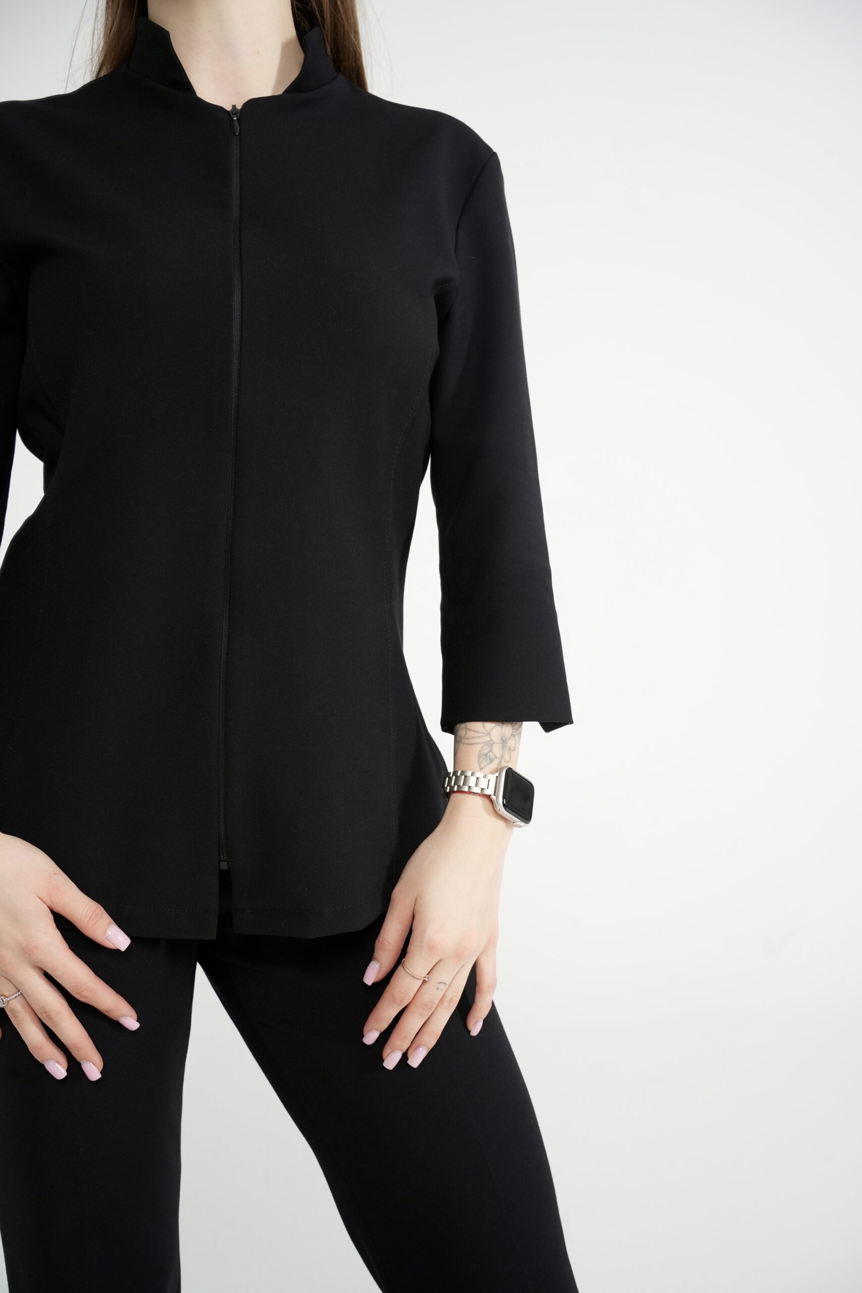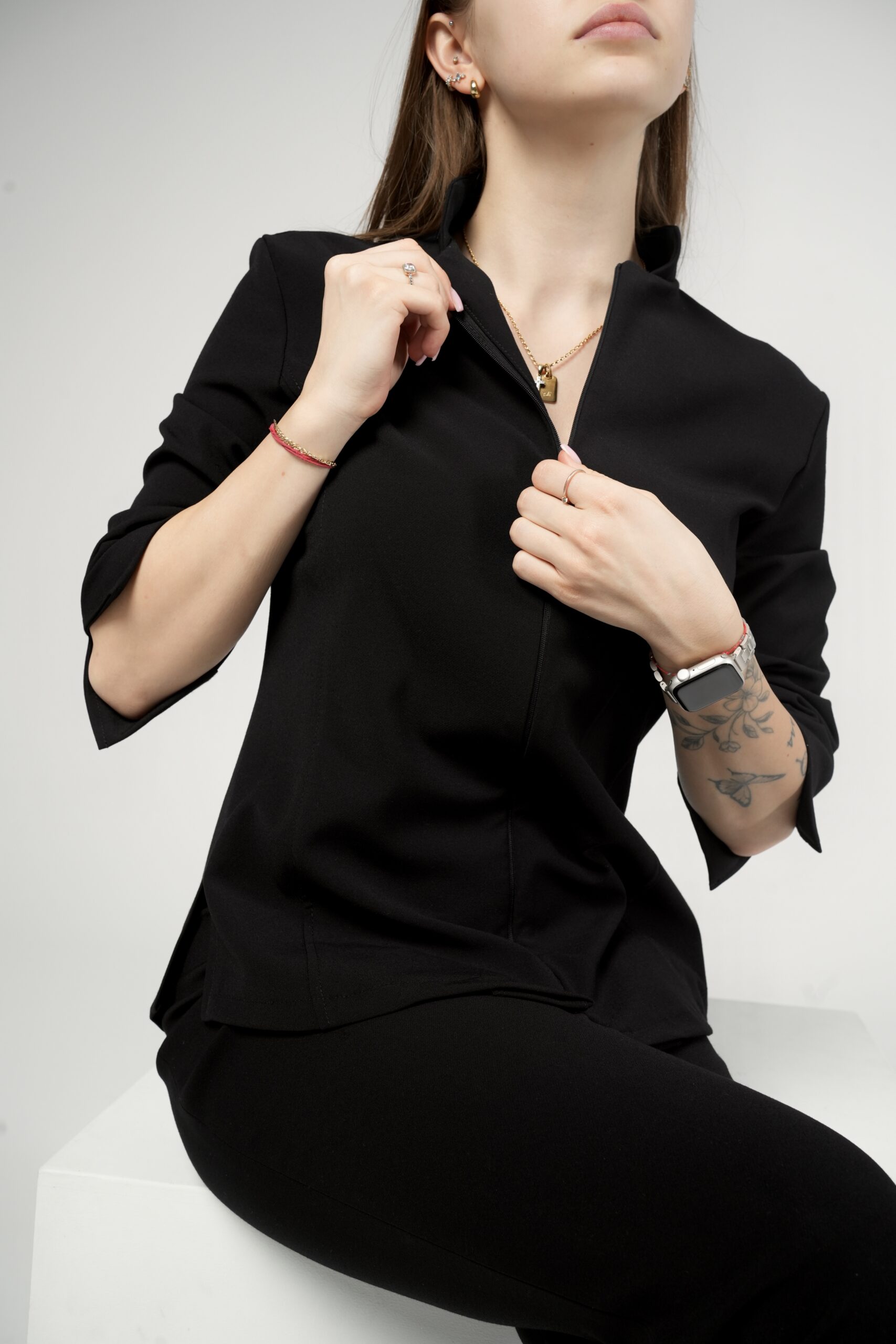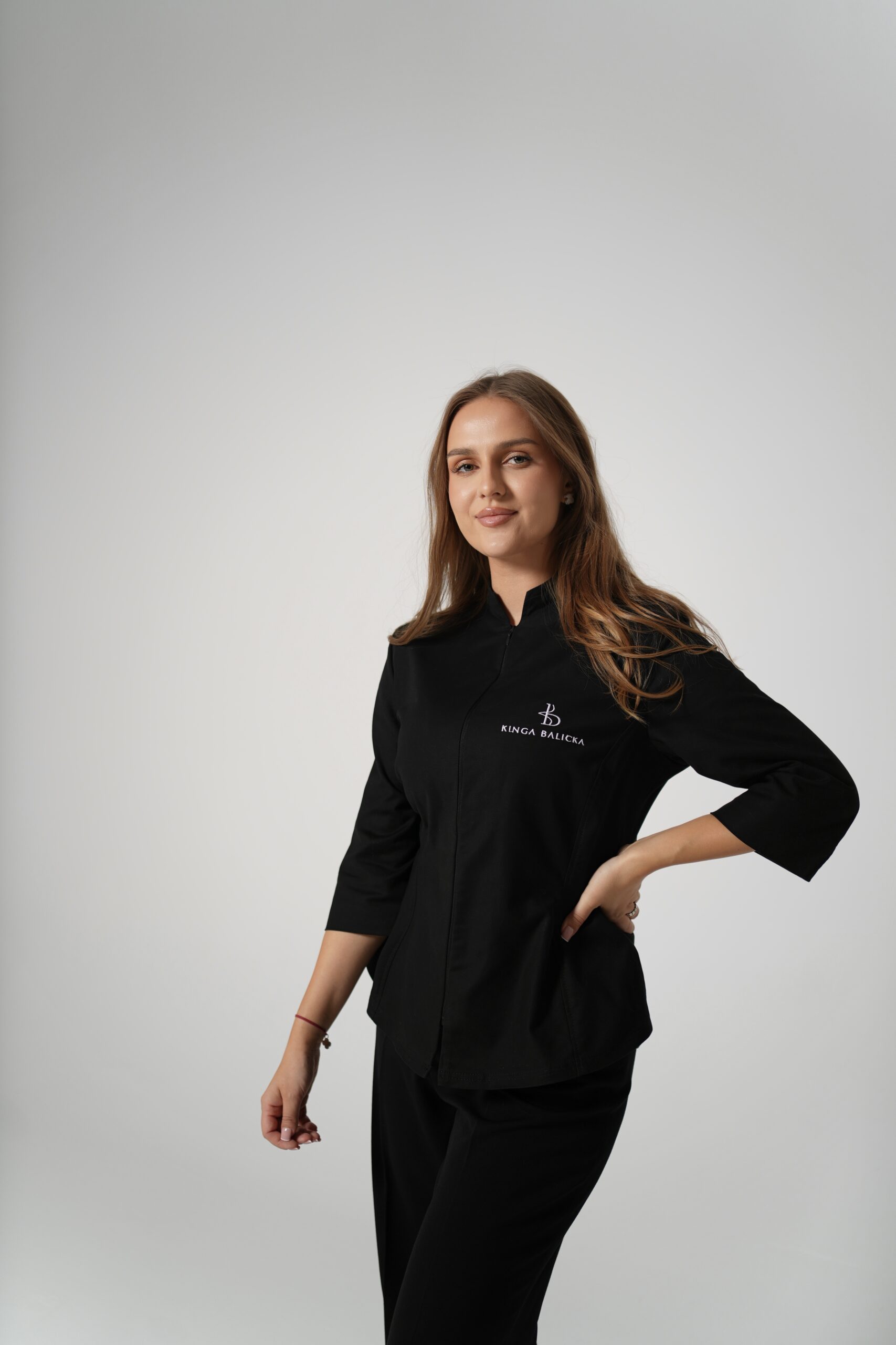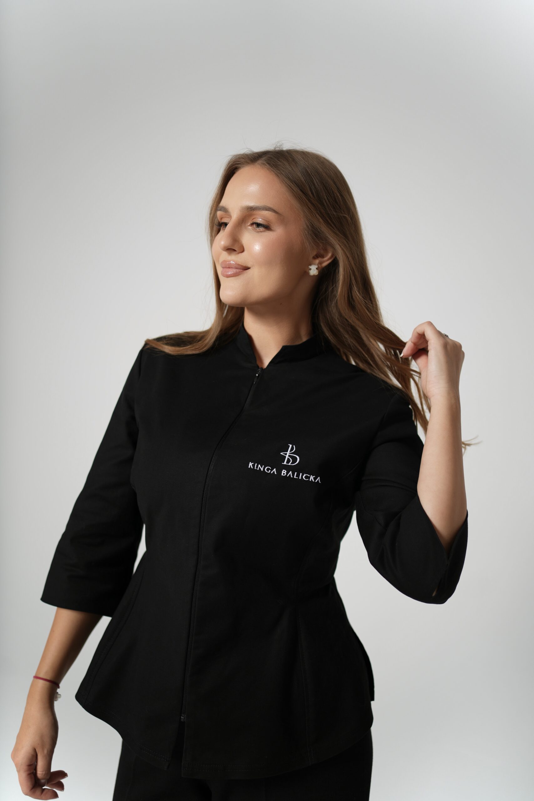 Elegancki mundurek ze stójką, który łączy klasykę z nowoczesnym stylem. Idealny wybór dla osób ceniących wygodę i schludny wygląd na co dzień.